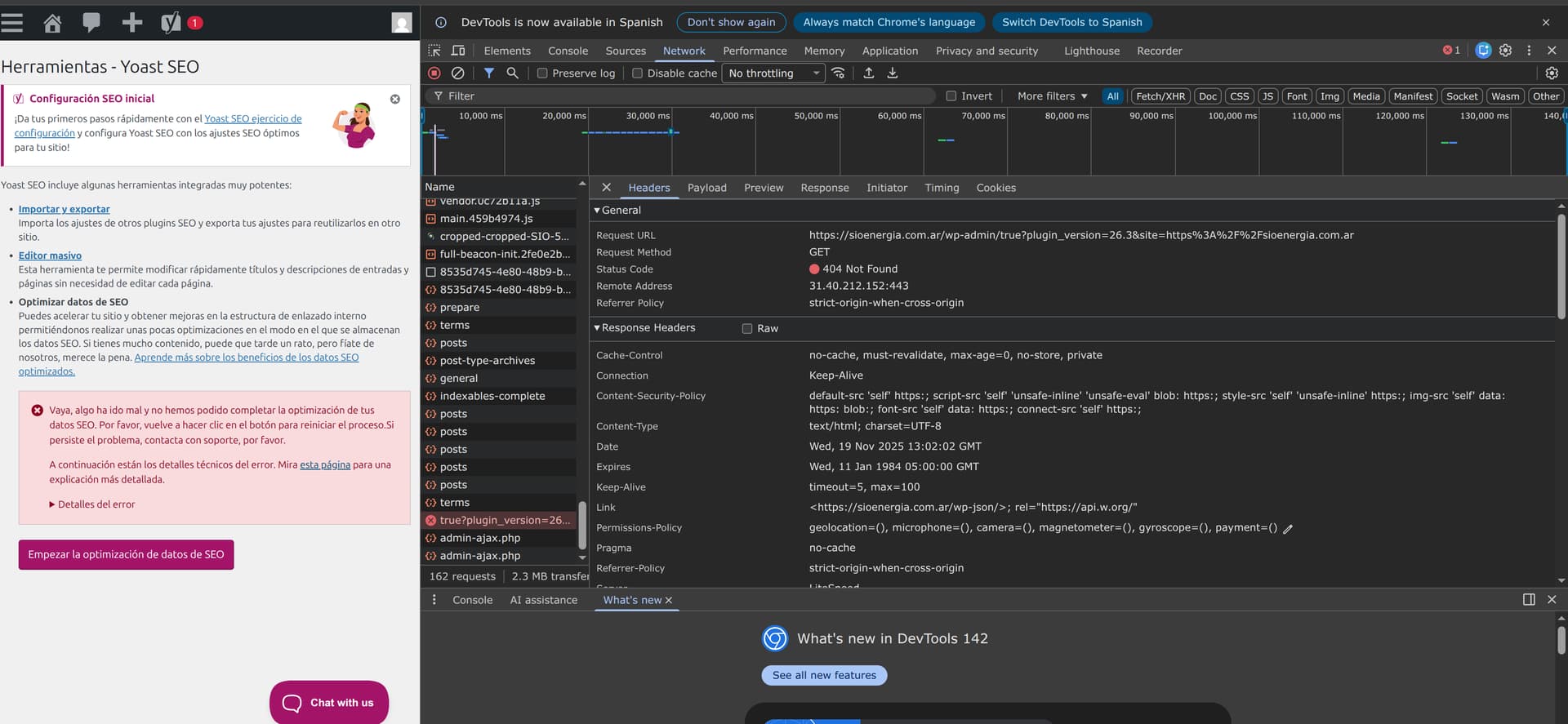 api.yoast.com), la variable interna del plugin se ha roto y dicetrue. - Por eso el navegador intenta ir literalmente a una página llamada “true”, que no existe (Error 404).