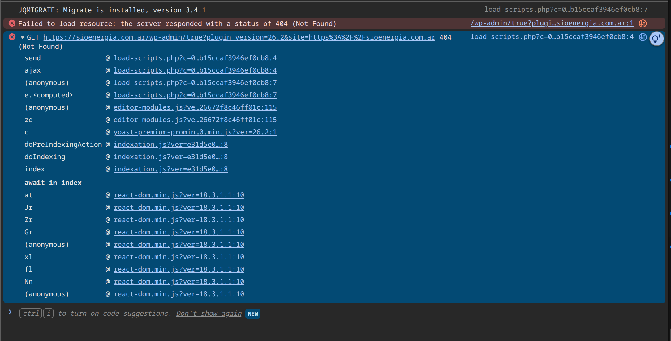 Fíjate en la URL que da error: true?plugin_version=26.3&site=....
